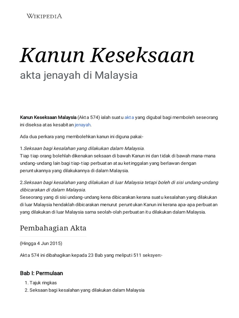 Kanun Keseksaan Malaysia Akta 574 ialah suatu akta yang digubal bagi memboleh seseorang ini diseksa atas kesabitan jenayah. Human translations with examples. Get directions reviews and information for.